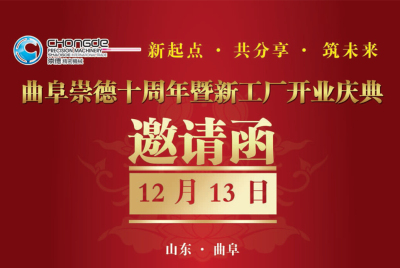 孔子曰:“有朋自遠(yuǎn)方來,不亦樂乎!”感謝您對(duì)曲阜崇德的信任與支持,我們希望可以與您繼續(xù)攜手,再創(chuàng)輝煌!竭誠邀請(qǐng)您前來參加曲阜崇德新工廠開業(yè)與十周年慶典活動(dòng),全面感受到一個(gè)生機(jī)盎然、蓬勃發(fā)展的曲阜崇德!